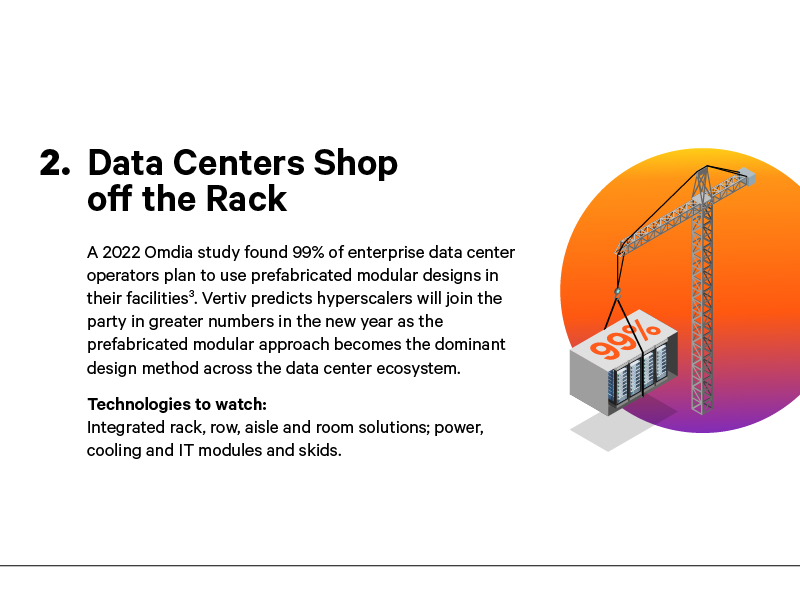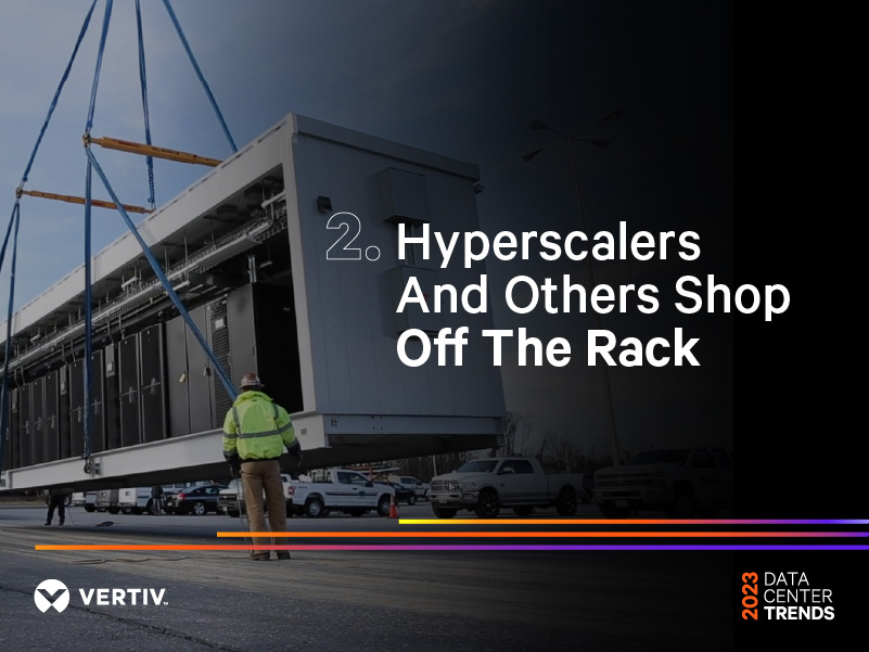 Laut einer vor Kurzem von Omdia durchgeführten Umfrage geben 99% der Betreiber von Rechenzentren in Unternehmen an, dass vorgefertigte, modulare Rechenzentrumsdesigns Teil ihrer Rechenzentrumsstrategie für die Zukunft sein werden. Das ist mehr als nur ein Trend. Das ist die neue Normalität. Für das Jahr 2023 erwarten die Experten von Vertiv bei Hyperscalern eine kontinuierliche Verschiebung in die gleiche Richtung, da sie die Geschwindigkeit und Effizienz anstreben, die durch Standardisierung ermöglicht werden.