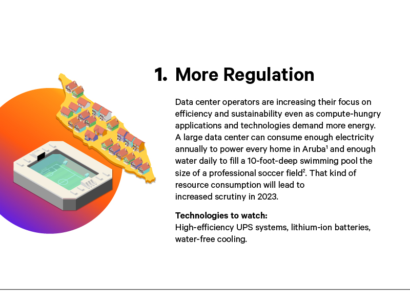 Der zunehmende Druck, die Nachfrage der Verbraucher nach Energie und Wasser zu befriedigen, zwingt Regierungen auf allen Ebenen dazu, Rechenzentren und deren enormen Verbrauch an diesen Ressourcen genauer zu betrachten. Es wird geschätzt, dass Rechenzentren heute für bis zu 3 % des globalen Stromverbrauchs verantwortlich sind und bis zum Jahr 2030 voraussichtlich 4 % erreichen werden. Eine durchschnittliche Hyperscale-Anlage verbraucht jährlich 20–50 MW Strom – theoretisch genug, um bis zu 37.000 Haushalte mit Strom zu versorgen. Die Experten von Vertiv gehen davon aus, dass dies im Jahr 2023 von staatlicher Seite zunehmend überprüft werden wird.