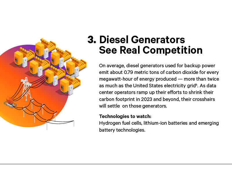 Dies sind Übergangsschritte, um die Rolle des Generators zu minimieren, während die Branche nach anderen Optionen sucht – darunter neue Batterietechnologien – um eine länger anhaltende Backup-Stromversorgung zu erhalten. Für das Jahr 2023 gehen die Experten von Vertiv davon aus, dass sich eine bevorzugte Alternative herausstellen wird, insbesondere mit Wasserstoff betriebene Brennstoffzellen. Solche Brennstoffzellen funktionieren zunächst ähnlich wie ein Generator und bieten eine momentane Stromversorgung für die Verbraucher. Später könnten sie für den längeren oder sogar kontinuierlichen Betrieb dienen.