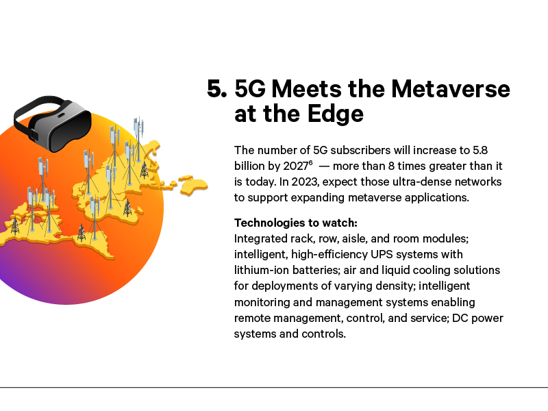 In seiner Mobile Subscription und Revenue Forecast 2022 prognostiziert Omdia, dass fast die Hälfte aller Mobilfunkverträge – mehr als 5,8 Milliarden – bis zum Jahr 2027 5G sein werden. Damit rückt die Datenverarbeitung immer näher an den Benutzer. Das Metaverse ist eine Anwendung, die auf der Suche nach einem ultradichten Rechnernetzwerk mit niedriger Latenz ist. Im Jahr 2023 werden sich diese beiden Aktivitäten überschneiden, und Metaverse-Implementierungen werden 5G-Netze für ihre Anwendungen nutzen, um sich deren extrem niedrige Latenz zunutze zu machen. Letztendlich wird dies an den 5G-Edge-Standorten eine höhere Rechenleistung erforderlich machen, und das schon sehr bald. Die ersten Vorstöße werden im Jahr 2023 erfolgen, gefolgt von umfassenderen Bereitstellungen im Laufe der nächsten Jahre. Mit zunehmender Komplexität am sogenannten Netzwerkrand wird auch die dafür erforderliche Infrastruktur zunehmend komplexer werden. Dazu gehören Technologien wie Planungs- und -Managementsysteme, die künstliche Intelligenz und virtuelle Realität nutzen, sowie die verstärkte Nutzung von USV-Systemen mit Lithium-Ionen-Batterien am sogenannten Netzwerkrand – ein anhaltender Trend, der laut IDC einen Anstieg des Marktanteils von 2 % des Umsatzes im August 2021 auf 8 % bis August 2022 erlebt hat.