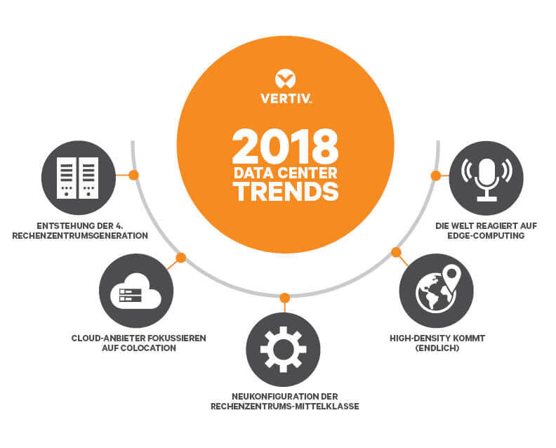 In der Vergangenheit hatte Vertiv Trends rund um die Themen Cloud, integrierte Systeme und Infrastruktursicherheit identifiziert. Für 2018 erwartet das Unternehmen folgende fünf Trends, die das Ökosystem rund um Rechenzentren prägen werden: