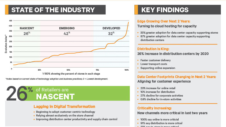 - To become more developed and open the silos, retailers need to adopt distribution center technologies such as analytics, IoT to cloud, machine learning and robotics.