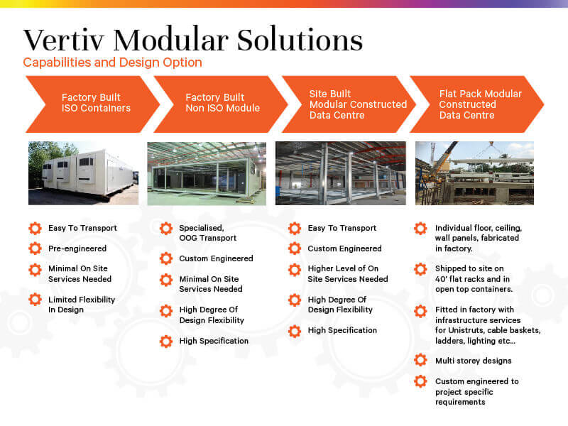 Prefabricated modular data centers are a viable solution to scale faster to respond to the rapidly changing demands in the data center space. Unlike traditional brick-and-mortar designs, prefabricated modular data centers, or containerized data centers, are engineered to meet business-specific requirements to fit in a right-sized secure infrastructure. Vertiv’s prefabricated data center modules let you expand your data center capacity wherever and whenever you need it while offering minimized cost, unmatched flexibility and scalability.