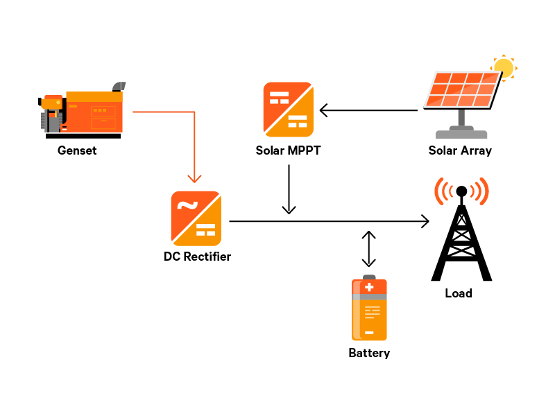 Solar supplements genset usage together with high-cyclic charge/discharge batteries.