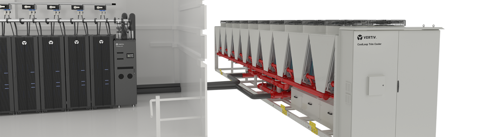 The Vertiv™ CoolLoop Trim Cooler is an energy-efficient and space-saving solution designed to operate with fluctuating water temperatures common to AI and HPC applications