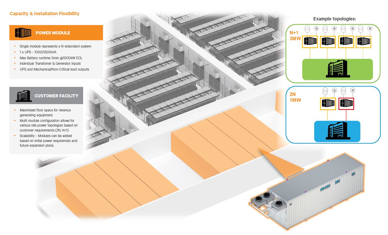 Rapidly construct redundant blocks of 1000 or 1200 kVA/kW critical power infrastructure for new or existing facilities