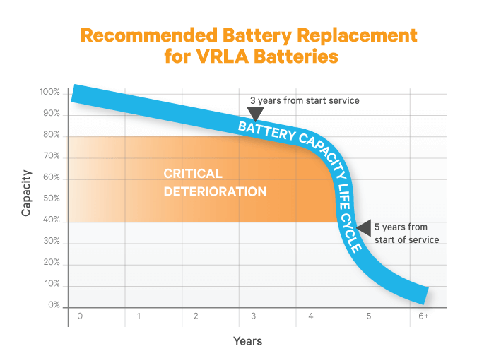 Adopt a proactive battery and UPS component replacement plan. Based on our experience and extensive industry data, we know that the actual life of your DC power system is almost always shorter than the design life. Replacement and upgrade services center on assessing your system components’ condition and replacing batteries and UPS equipment before they fail, ensuring your system will always deliver.