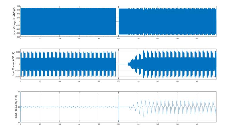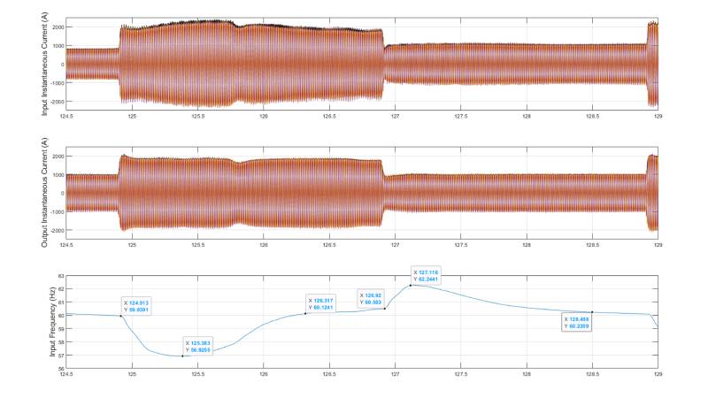 In this scenario, the performance of Liebert® EXL S1 during a transition from utility power to generator power was analyzed. Key parameters such as input voltage, current, and frequency were recorded to observe the effects of the automatic transfer switch's break-before-make transition. The primary focus was to assess the UPS's capability to maintain stable output voltage, current, and frequency during this critical transition period. The AI power load's pulsing nature introduced fluctuations in the input signals. Despite this, the UPS system successfully maintained consistent output parameters, managing power source transitions without compromising the load's stability.