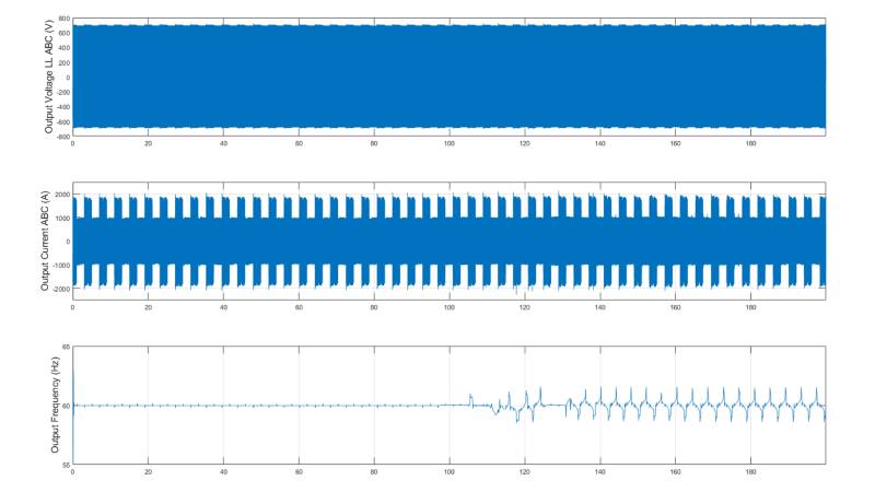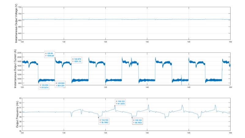 In this scenario, the performance of Liebert® EXL S1 in handling AI workloads while operating on utility power was evaluated. The analysis focused on input and output voltage, current, and frequency during multiple AI training cycles. The AI power load introduced rapid changes in current, creating significant fluctuations in the input signals. Despite these fluctuations, the UPS system effectively regulated the output, maintaining stable voltage and frequency. Detailed observations showed that the UPS handled the pulsing AI power load without significantly impacting the output parameters.
