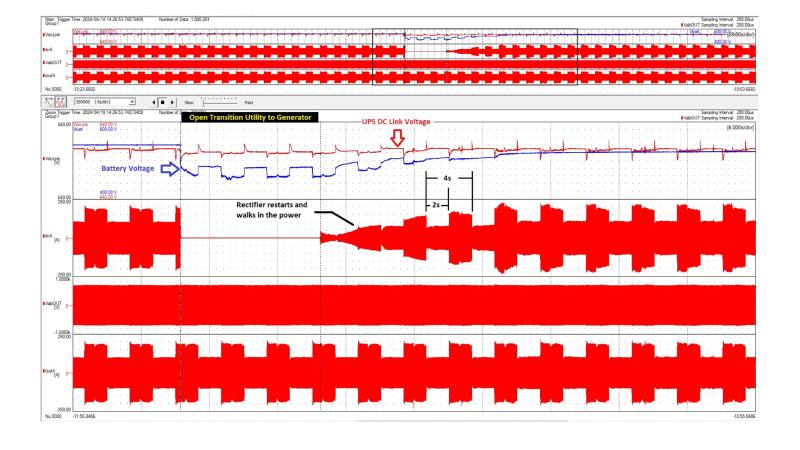The following shows the macro view of the battery voltage and UPS DC Link voltage (top trace), Phase A Input current (2nd trace), Phase A Output voltage (3rd trace), and Phase A Output current (4th trace). The battery current was not able to be measured since the battery was only used during the break-before-make transfer from the utility to the generator. Otherwise, the battery is never used as the load from high-performance computing applications pulses. The output voltage is maintained well within IEC Class 1.