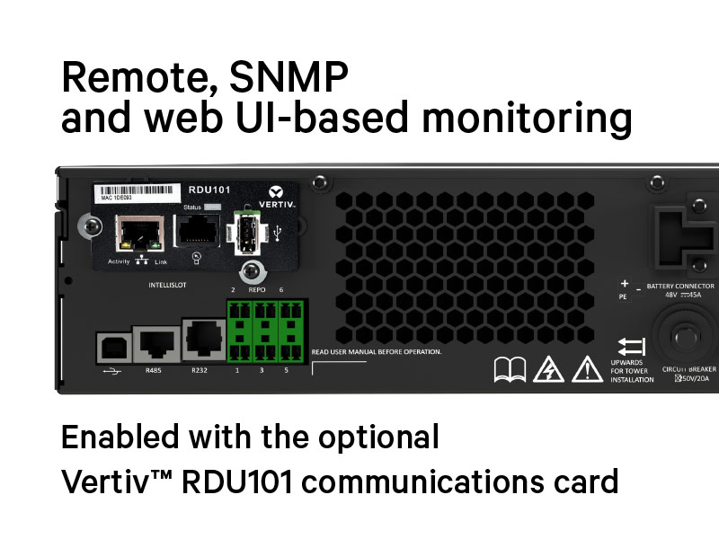 The Vertiv™ RDU101 network interface card (NIC) for SNMP communications and environmental sensor support, included and factory pre-installed on 5-10kVA models