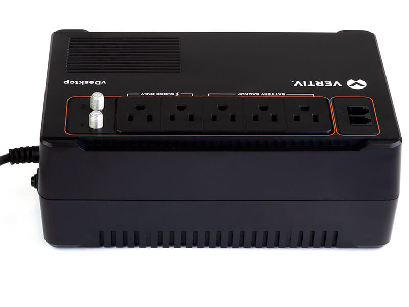 Provides battery backup for computers, monitors, routers, modems, gaming consoles and other electronics, allowing time for an orderly shutdown during a power outage, or enough time to carry through brief outages. With 5 available receptacles, two surge-only and three surge with battery backed outlets, your devices are protected from potential damage. The Vertiv™ Desktop UPS is an economical and reliable choice to protect your equipment and keep you connected.