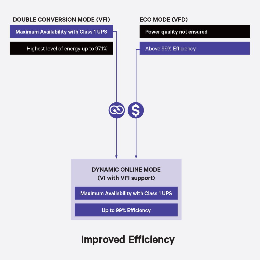 • HIGH EFFICIENCY: It can achieve up to 97.5% double conversion efficiency and up to 99% with dynamic online mode. • COMPACT FOOTPRINT: Manage space constraint while meeting increasing data center power demands with room to prefabricated deployment. • IDEAL FOR HIGH-DENSITY APPLICATIONS: It supports large-scale data centers. • AVAILABLE ACROSS THE GLOBE: Compliant with both CE and UL standards, it is designed, tested and available worldwide. • RELIABILITY & RESILIENCE: It is designed to provide continuous power quality and availability and to meet the contemporary resilience benchmarks.