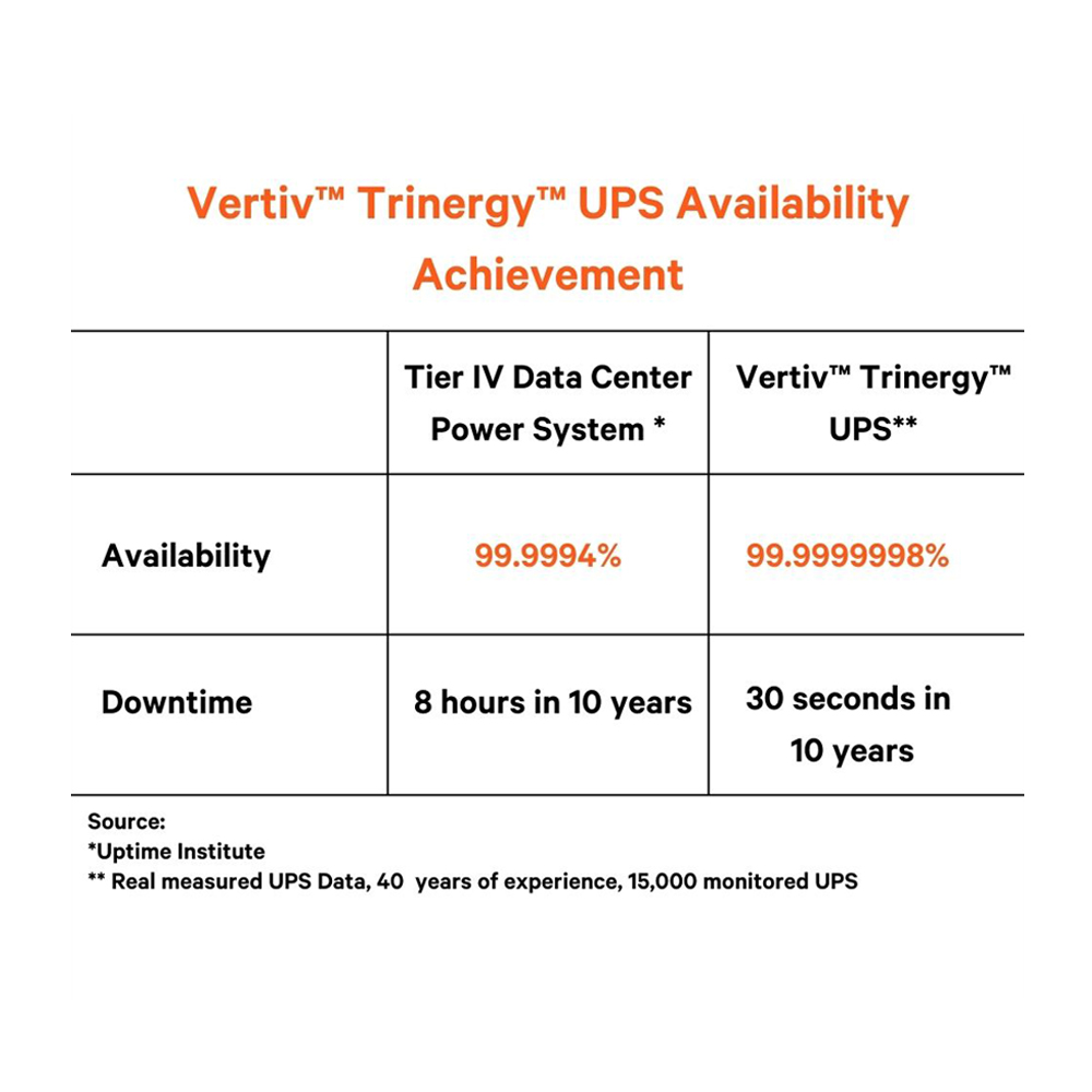 • NO SYSTEM DOWNTIME: It facilitates maintenance and power upgrades without interruption, leading to enhanced operational availabulity and preventing unplanned outages. • DISTRIBUTED BATTERIES: This enhances fault tolerance and system availability by improving performance with various failure modes. • CAPACITY & INSTALLATION FLEXIBILITY: From 1.5MW up to 20MW, this power solution can adapt to your system needs in power capacity, redundancy and design. • ENERGY SAVINGS & MANAGEMENT: This compact, optimized power solution with simple interface offers maximum energy savings and rapid return on investment. • RICH DIGITAL EXPERIENCE: Service empowered by data across entire life with cycle with optional Vertiv Life Advances Incident Management and Condition Based Maintenance.
