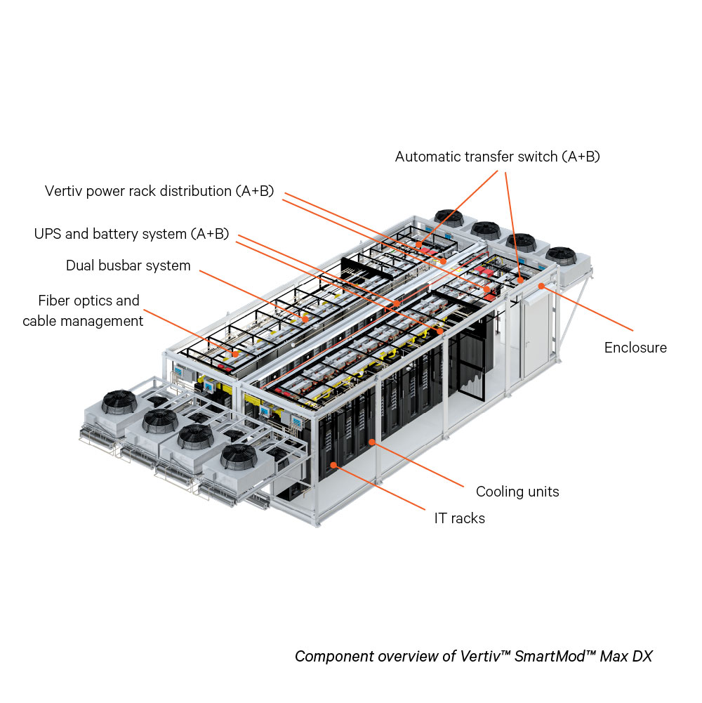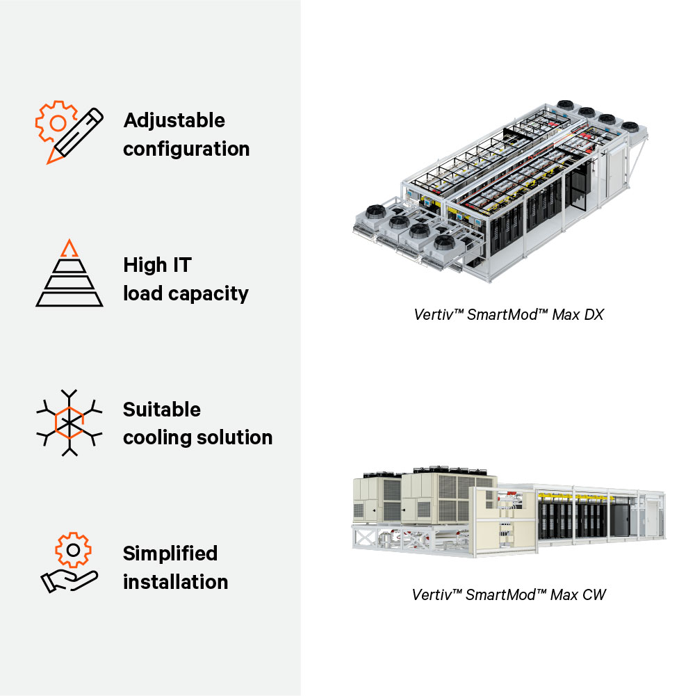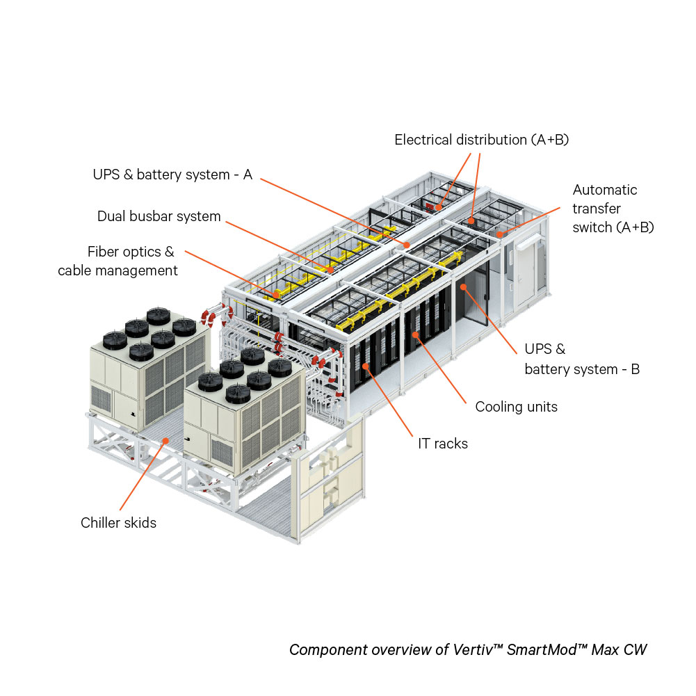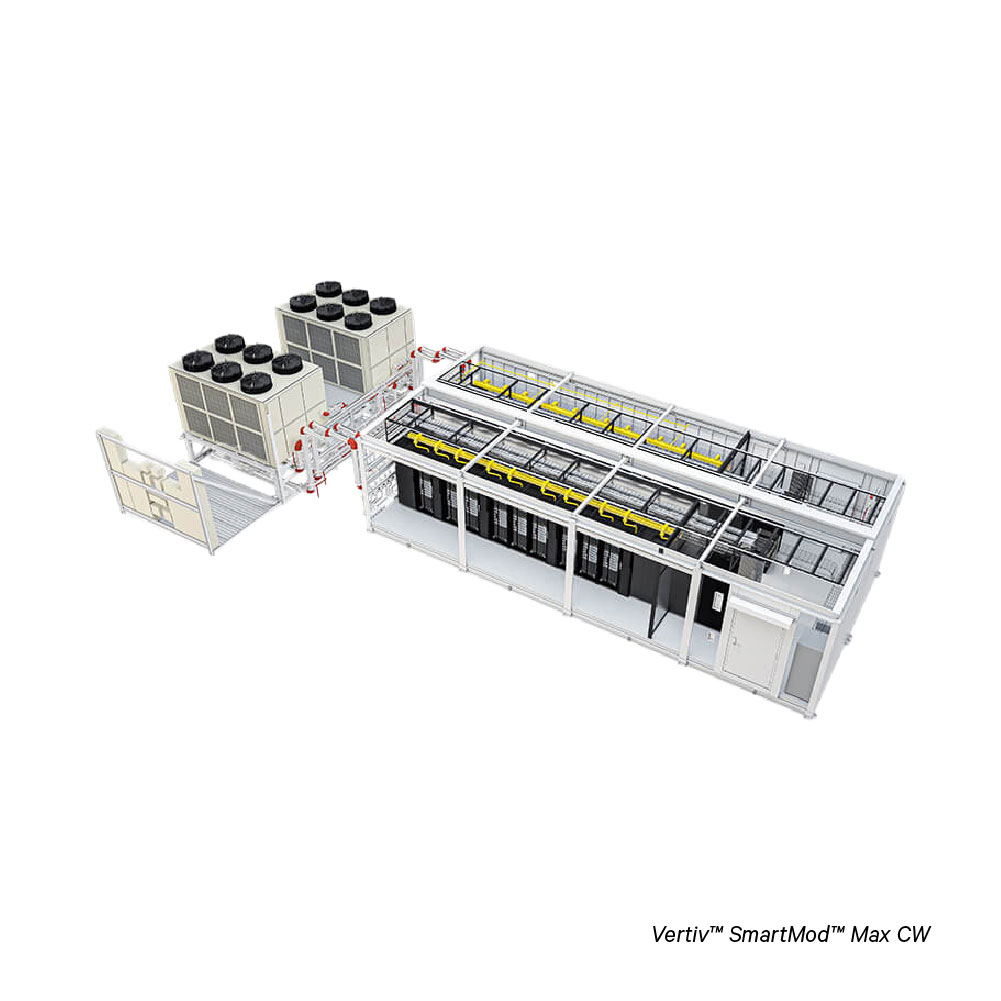 • REDUCED ENVIRONMENTAL IMPACT: The Vertiv™ SmartMod™ Max CW variant uses chilled water cooling, helping reduce direct environmental impacts in data center applications.​