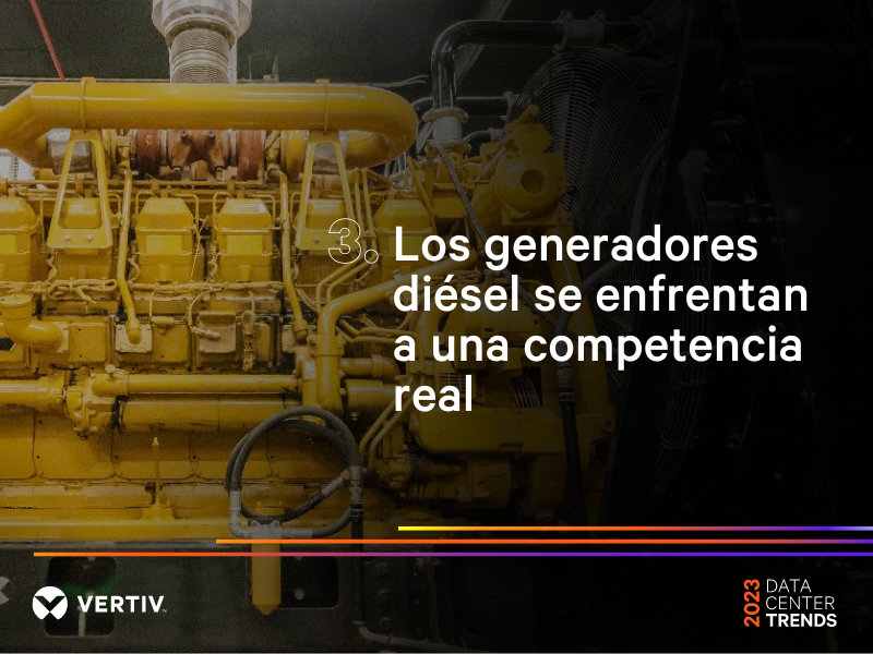 Estas son medidas de transición para minimizar el papel de los generadores mientras la industria busca otras opciones— incluidas las nuevas tecnologías de baterías— para un respaldo prolongado. En 2023, los expertos de Vertiv prevén que una alternativa emergente será la preferida: las celdas de combustible de hidrógeno. Al principio, estas celdas de combustible funcionarán como un generador, al soportar la carga momentáneamente, y eventualmente prometen una operación prolongada o incluso continua.