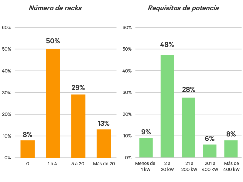 En la actualidad, el “típico” sitio en el borde aloja entre uno y cuatro racks para equipo de TI con requisitos de potencia entre 2 y 20 kW, aunque son comunes sitios más grandes. El 42 % de los sitios estaba compuesto por más de cuatro racks para equipo de TI y mostró requisitos de potencia por encima de los 20 kW (Figura 4).