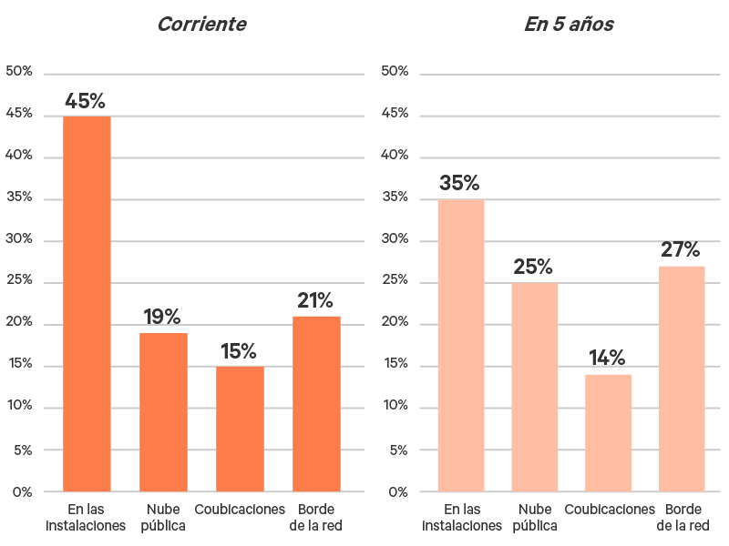 El influjo de nuevos sitios en el borde aumentará la dependencia en el borde de la red. Los encuestados estiman que el porcentaje de infraestructura de TI implementada en el borde crecerá del 21 % actual al 27 % en cinco años. Además, esperan que el porcentaje de infraestructura de TI centralizada en las instalaciones disminuya en un 22 %, mientras que el de recursos en la nube aumente en un 32 % y en el borde un 29 % (Figura 2).