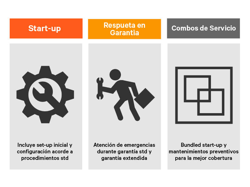 - Mantenimiento preventivo acorde a procedimientos certificados como fabricantes, esquemas de atención de emergencias con diferentes coberturas y disponibilidad de repuestos