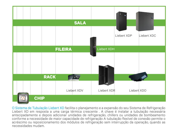Os módulos de refrigeração à base de refrigerante Liebert XD funcionam como um sistema integrado de gerenciamento térmico para dar suporte ao resfriamento de Data Centers de alta densidade de calor com abordagem de corredor quente / corredor frio.