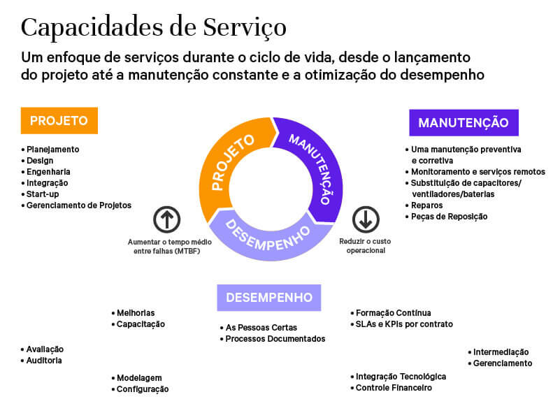 Nosso enfoque para prestar serviços para a infraestrutura crítica cobre todos os aspectos de disponibilidade e desempenho em todos os tipos de sites e de ambientes, desde salas de TI e sites perimetrais até grandes data centers e instalações industriais.